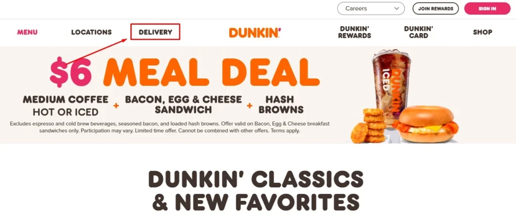 - Go to the Dunkin Donuts official Website and click on “Delivery.”